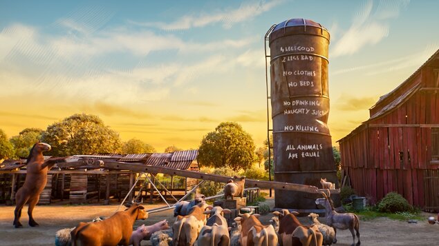 Keď sa zvieratá na farme vzbúria proti svojmu ľudskému majiteľovi a vyženú ho, zdá sa, že pre nich konečne nastal krásny čas naplnený slobodou, rovnosťou a spravodlivosťou. Túto novú príležitosť však niektoré zvieratá dokážu zneužiť. Pôvodne osloboditeľská revolúcia proti tyranii sa tak postupne mení na úplne nový systém, ktorý je založený na útlaku. Pravda sa prepisuje, spoločné ideály miznú pod tlakom vynútenej poslušnosti. Nastupuje poriadok postavený na manipulácii, propagande a predovšetkým strachu. Dokáže sa tomu niekto postaviť?